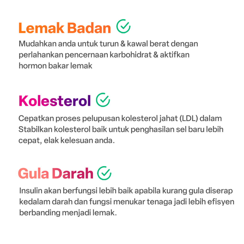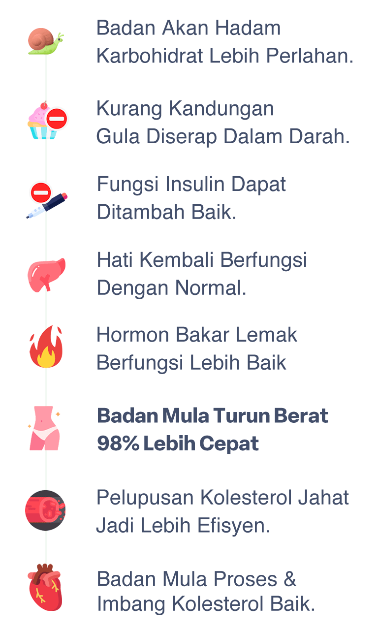 BIOKENAF® target baiki proses metabolisma badan dengan merawat pencernaan karbohidrat, perlahankan serapan gula ke dalam darah jadikan fungsi insulin & hati lebih baik, mengakibatkan hormon pembakar lemak aktif secara berterusan. Hasilnya, usaha untuk anda buang lemak & turun berat jadi lebih mudah, cepat dan kekal.